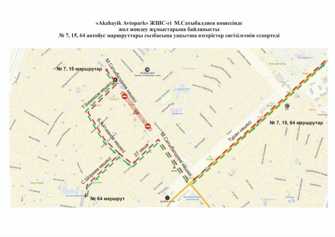 Осыған байланысты осы көше бойымен қатынайтын қоғамдық көліктердің қозғалыс бағыты уақытша өзгертіледі. Жаңартылған маршруттар мен балама жолдар арнайы әзірленген картада көрсетілген.