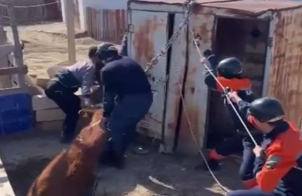 Атырау қаласы маңындағы Бірлік ауылында Мұстафин көшесінде ашық кәріз құдығына сиыр түсіп кетіп, өздігінен шыға алмады.