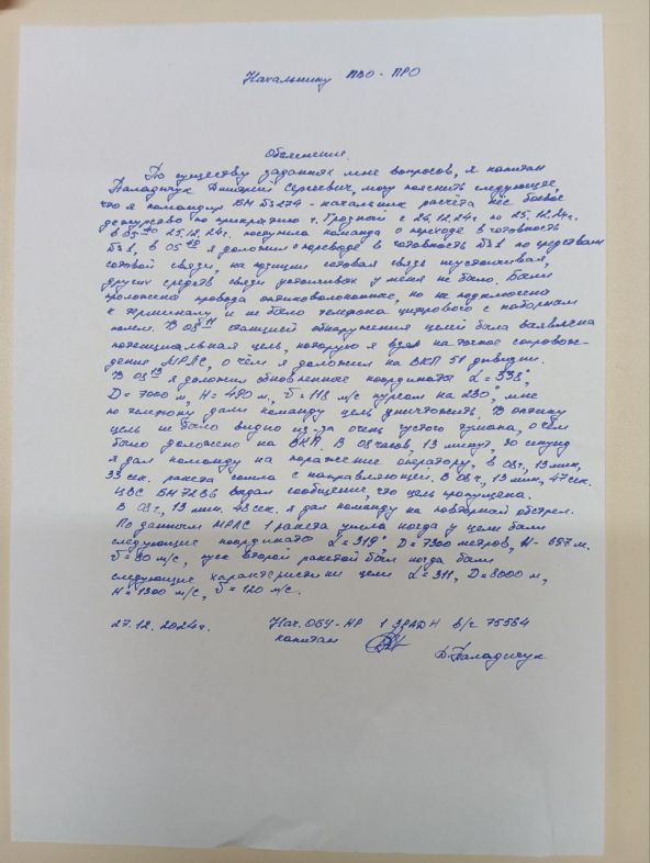Ақпаратқа сүйенсек, хатпен бірге зымыран атылған сәттің бейне және аудио жазбалары да ұсынылған. Паладичук тұман салдарынан көзбен көру мүмкін болмағанын, алайда радар арқылы нысан анықталған соң, оны жоюға бұйрық бергенін айтқан. Бірінші зымыран мүлт кеткен соң, екіншісін атуды да өзі бұйырған.