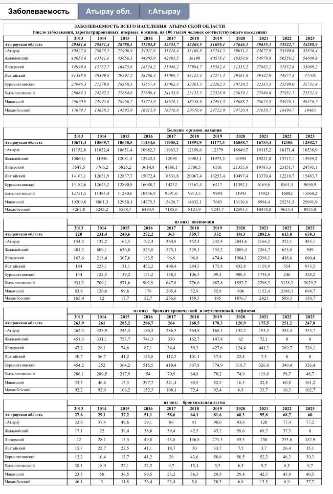 Созылмалы бронхит пен бронхиалдық астма көрсеткіштері де тұрақты өскен. Әсіресе Индер ауданында. Жылыой ауданы бойынша бұл екі ауру түрі туралы 2023 жылғы статистика мүлде жоқ.