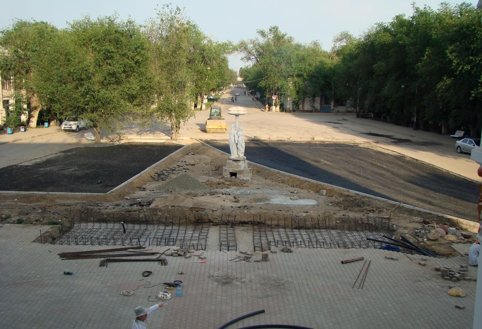 Жұмыстың тоқтауына жобаны қайта түзету жұмыстарының басталуы себеп болғанын айтты (мұнымен да сол мердігер компания айналысты). Жобалауға Құрманғазы атындағы Мәдениет сарайы маңындағы аумақты абаттандыру үшін түзету енгізу керек болған. Алайда нәтижесінде ештеңе жасалмады.