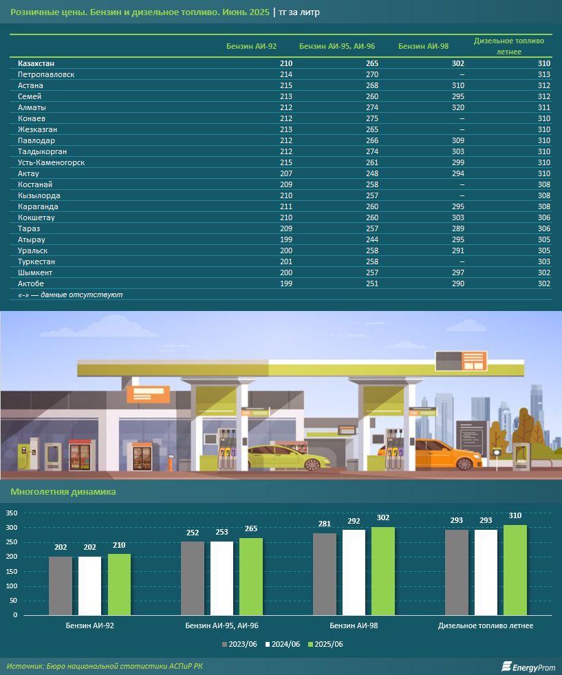 Қазақстан қалаларының арасында маусым айында АИ-92 бензині ең қымбат Астана мен Өскеменде (литрі 215 теңге), АИ-95, АИ-96 — Қонаевта (275 теңге), АИ-98 — Алматыда (320 теңге), ал жазғы дизель отыны — Петропавлда (литрі 313 теңге) болды.