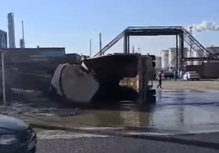 КамАЗ-ға орнатылған цистернадағы сұйықтық көлік аударылғаннан кейін жолға төгіліп, жергілікті тұрғындардың алаңдаушылығын тудырды.