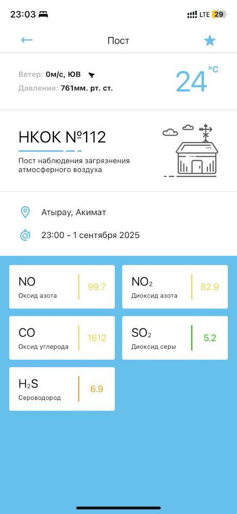 AirKz қосымшасының деректері бойынша, Загородный маңында күкіртсутектің шоғырлануы текше метріне 8,4 микрограмға, ал Восток ауданында 8,1 микрограмға жеткен. Бұдан бөлек, азот диоксидінің көлемі 54,7 микрограмға дейін көтеріліп, рұқсат етілген шектен асқан. Бұл көрсеткіштер адамдардың денсаулығына әсер етуі мүмкін