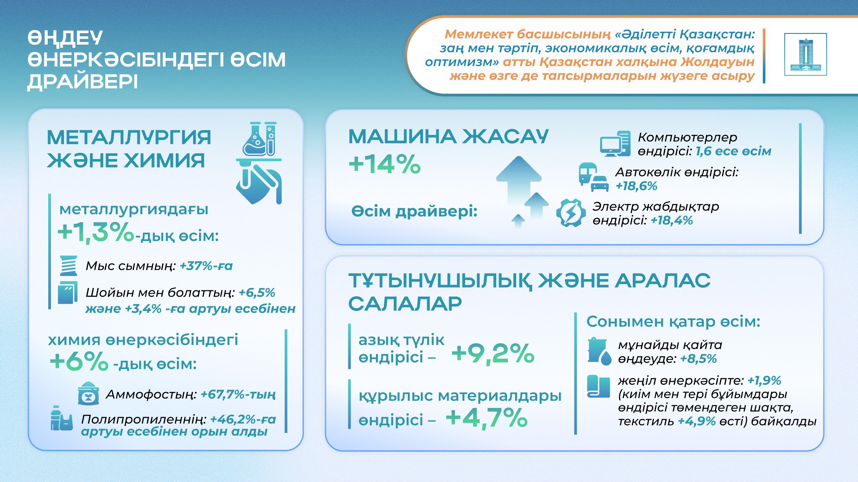 - Сондай-ақ тамақ өнімдерін өндіру (+9,2%), мұнай өңдеу (+8,5%), дайын металл бұйымдарын өндіру (+14%), резеңке және пластмасса бұйымдарын өндіру (+4%) және жиһаз өнеркәсібі (+1,6%) оң динамиканы көрсетті.