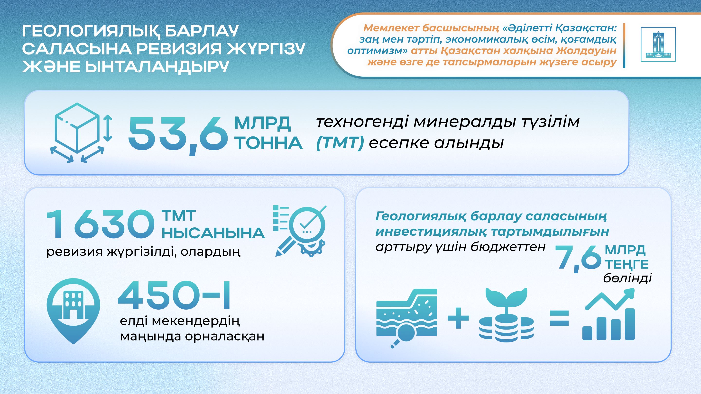 Техногендік минералдық түзілімдерге (ТМТ) тексеру жүргізілді, оның барысында көлемі 53,6 млрд тонна болатын 1 630 нысан ескерілді. Нақтырақ айтсақ, жер қойнауының мемлекеттік қорында жалпы салмағы 55 млрд тонна болатын 1 747 ТМТ нысаны бар, оның 450-і елді мекендерге жақын орналасқан, бұл оларды қайта өңдеудің маңыздылығын көрсетеді. Геологиялық барлаудың инвестициялық тартымдылығын арттыру үшін 2025 жылы бюджеттен 41 нысанды зерттеуге 7,6 млрд теңге бөлінді.