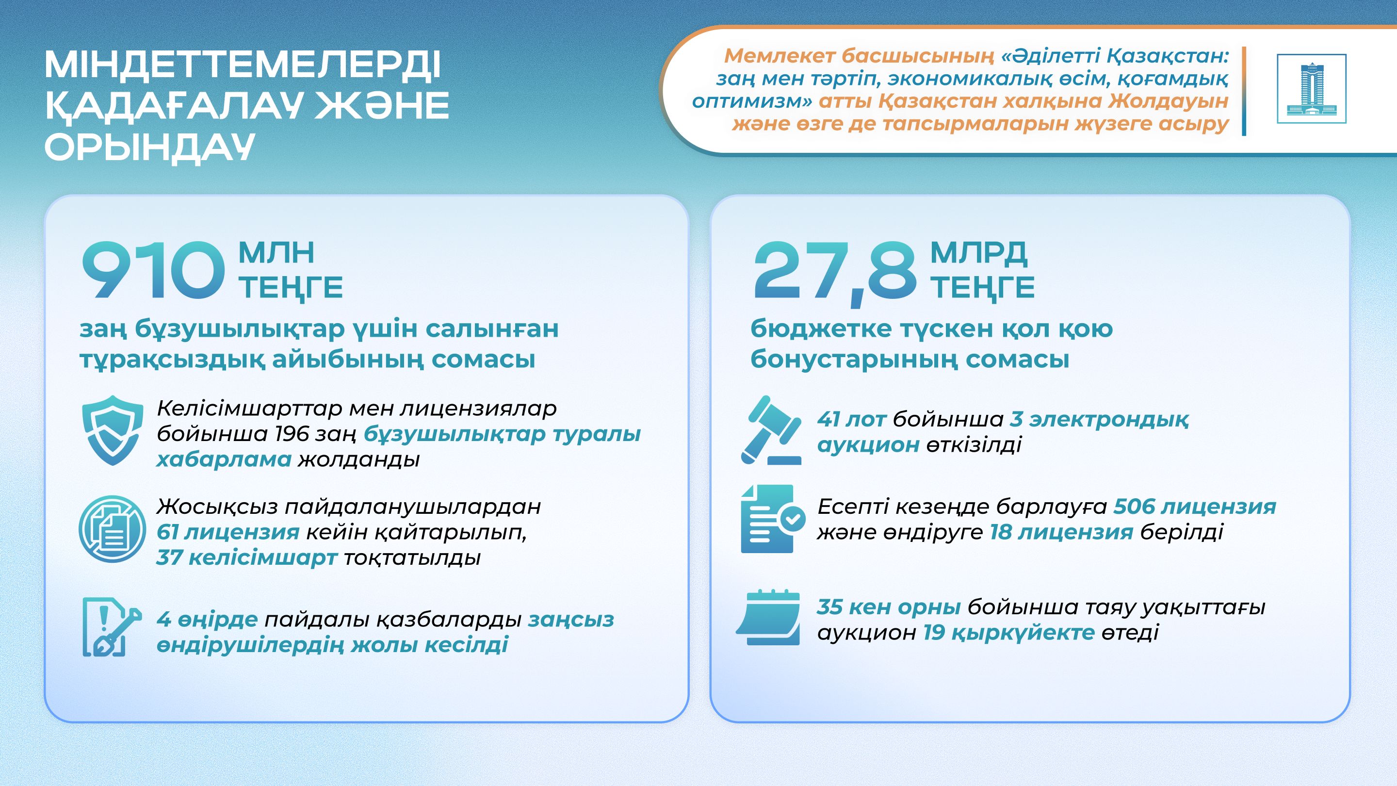 Бүгінгі таңда елде 2615 лицензия мен 319 келісімшарт бар (оның ішінде 122-сі барлауға, 134-і өндіруге және 63-і бірлескен барлау мен өндіруге). TGY платформасының арқасында 2443 жер қойнауын пайдаланушы есепті электронды түрде тапсырды. Мониторинг қорытындысы бойынша 196 келісімшарт пен лицензия бойынша бұзушылықтар туралы хабарламалар жіберілді, 910 млн теңгеге тұрақсыздық айыбы қойылды. 37 келісімшарттың қолданылуы тоқтатылды (оның 30-ы барлауға, 5-і өндіруге, 2-і бірлескен барлау мен өндіруге) және жосықсыз пайдаланушылардан 61 лицензия қайтарып алынды.