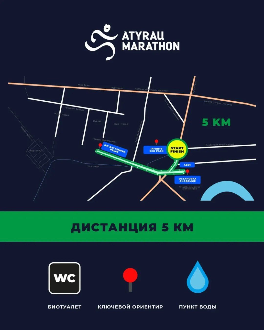 Жүгіру бағдарламасында қатысушылар 5 км, 10 км, 21 км және 42 км қашықтықты еңсереді. Жалпы жүлде қоры – 7 000 000 теңге.