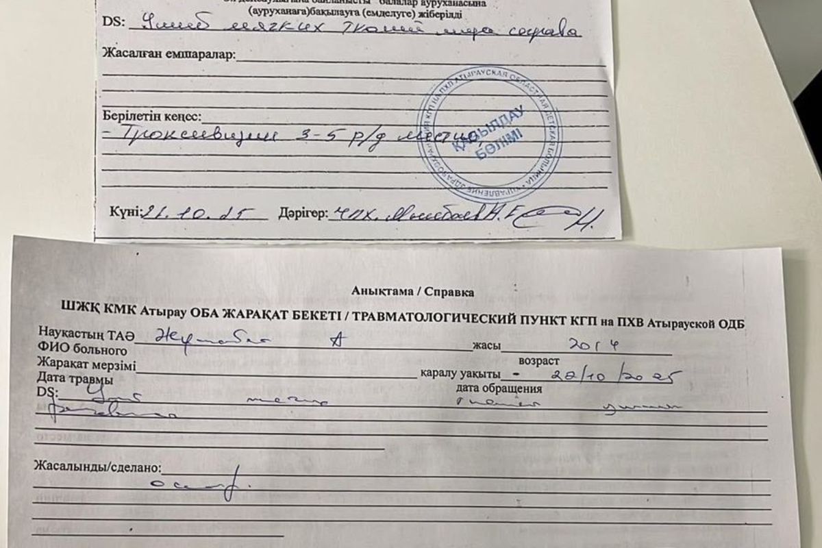 Дәрігерлер бала жарақат алды деп тіркеді. Ата-анасы полицияға арызданып, ҚР ҚК 140-бабы ("Кәмелетке толмаған баланы тәрбиелеу жөніндегі міндеттерді орындамау, қатыгездік таныту") бойынша арыз түсірді.