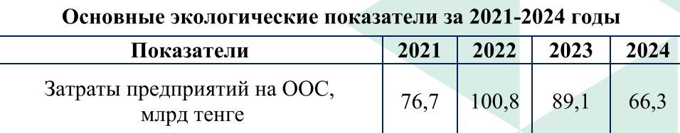 Атап өтсек, шығарындылар көлемі 2022-2024 жылдары ұлғайғанын атап өтеміз. Ал кәсіпорындардың қоршаған ортаны қорғауға жұмсайтын шығындары 2023 жылдан бастап төмендеп келеді.