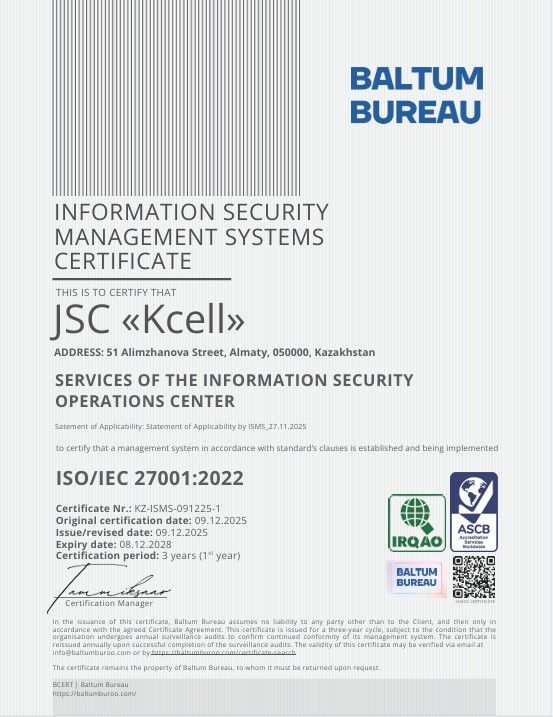 Бұл сертификатты алу Kcell және activ ақпараттық қауіпсіздікті басқару жүйесінің қатаң халықаралық талаптарға сәйкес келетінін растайды: абоненттік деректер сенімді түрде қорғалған, процестер ашық және киберқауіптер тәуекелдері азайтылған.