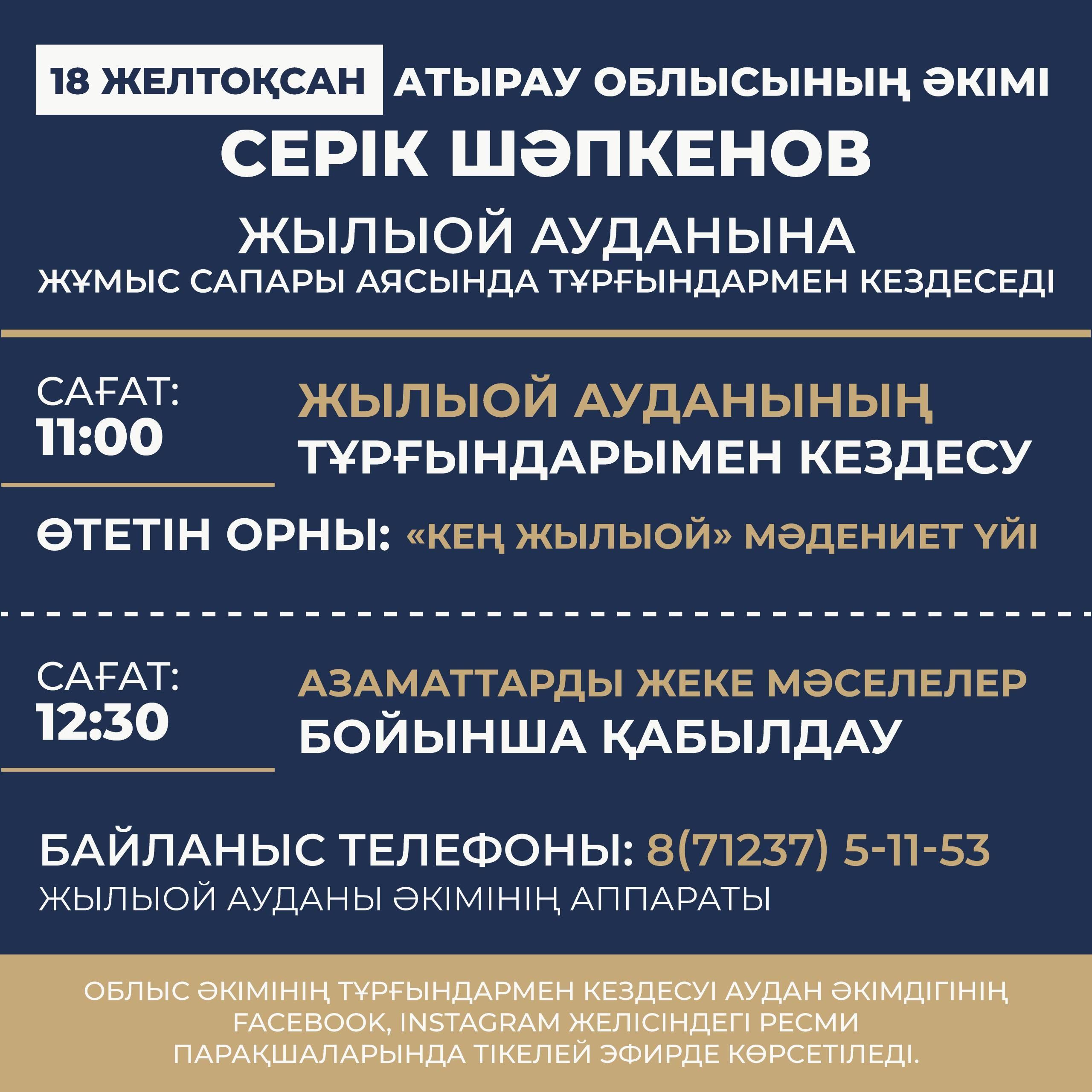 Атырау облысының әкімі Серік Шәпкенов 18 желтоқсанда Жылыой ауданына жұмыс сапары аясында тұрғындармен кездесу өткізеді.