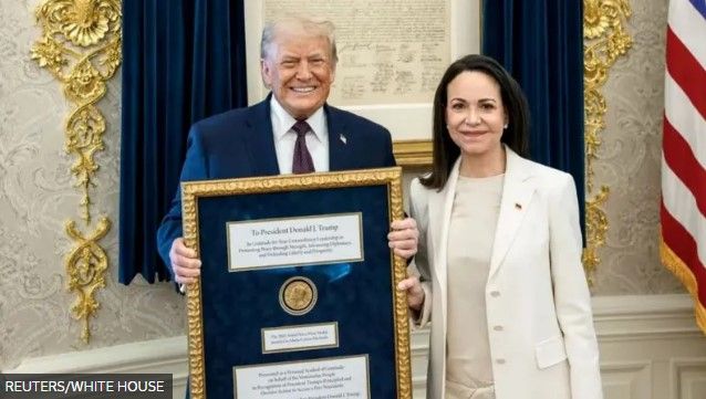 Венесуэла оппозициясының жетекшісі Мария Корина Мачадо АҚШ президенті Дональд Трампқа өзінің Нобель бейбітшілік сыйлығының медалін тапсырғанын хабарлады. Бұл оқиға олардың алғашқы жеке кездесуінде, бейсенбі күні Ақ үйде өтті, деп хабарлайды BBC News Русская служба.