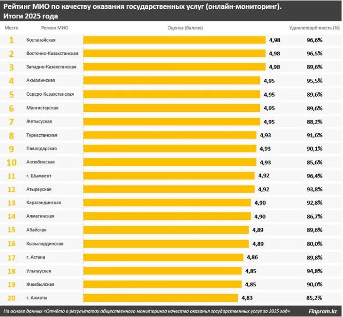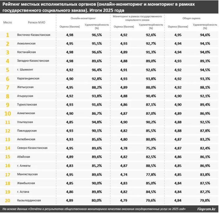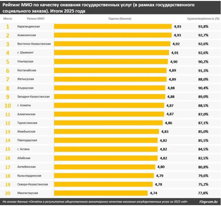Мемлекеттік әлеуметтік тапсырыс шеңберінде қызмет көрсету сапасы бойынша рейтингте Қарағанды облысының әкімдігі 4,93 балл және 93,8 пайыз толық қанағаттану деңгейімен көш бастады. Екінші орынды Ақмола облысының әкімдігі (4,93 балл және 92,7 пайыз), үшінші орынды Шығыс Қазақстан облысы (4,92 балл және 92,6 пайыз) иеленді.