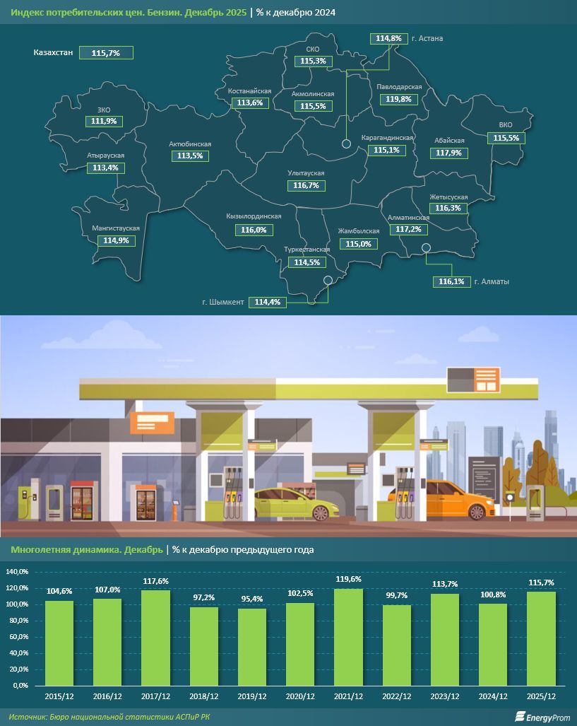 Өндіріс көлемінің артуына қарамастан, 2025 жылдың желтоқсанында бензин бағасы бір жылда 15,7%-ға қымбаттады. Бұл соңғы бес жылдағы ең жоғары өсім. Салыстыру үшін: 2024 жылы баға небәрі 0,8%-ға ғана көтерілген еді.