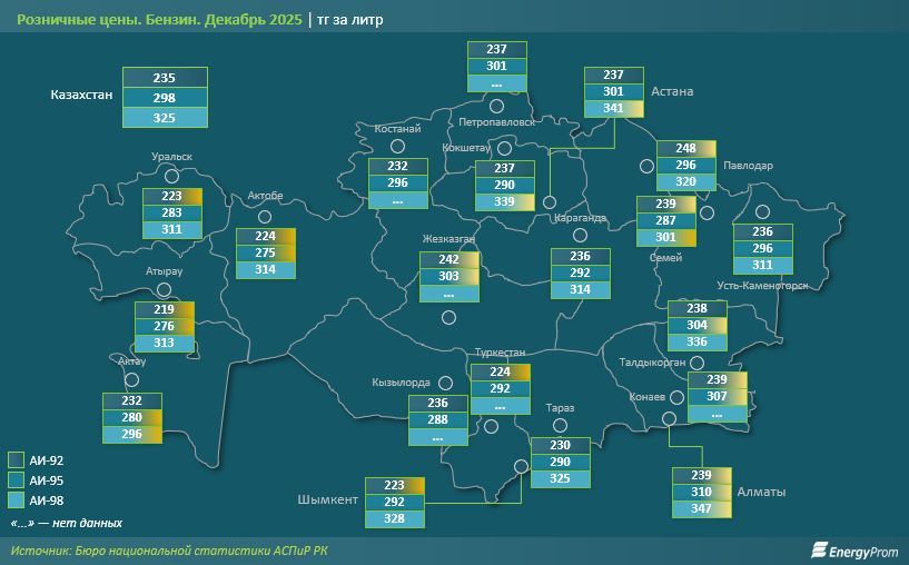 АИ-95 ең төмен бағада Ақтөбеде сатылды — 275 теңге, ал АИ-98 ең арзан Ақтауда болды — 296 теңге. Ең жоғары бағалар Алматы, Жезқазған, Қонаев, Павлодар және Семей қалаларында байқалды.