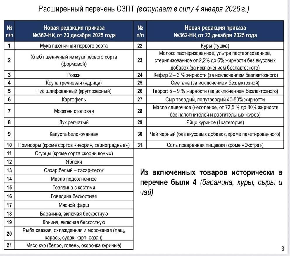 – Былтыр тізімге наннан бастап тұзға дейінгі тауарлар енген. Ал жаңа жылдан бастап 31 тауар тізіміне сиыр еті, қой еті, жылқы етінің сүйексіз бөліктері, яғни еттің барлық бөліктері – жамбас, мойын, сүйексіз еттер енгізілді. Бұған дейін сүйексіз еттер (мякоть), жауырын тұсы әлеуметтік маңызы бар тауарлар қатарына енбеген, – дейді Самат Емберген.