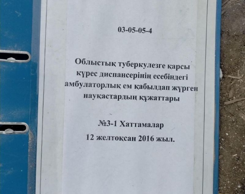 Табылған құжаттардың ішінде тіркеу формалары және басқа материалдар бар. Кейбір папкалардың сыртында: «Облыстық туберкулезге қарсы күрес диспансерінің есебіндегі амбулаторлық ем қабылдап жүрген науқастардың құжаттары» деген жазу бар. Сондай-ақ іс нөмірлері мен сақтау мерзімдері де белгіленген.