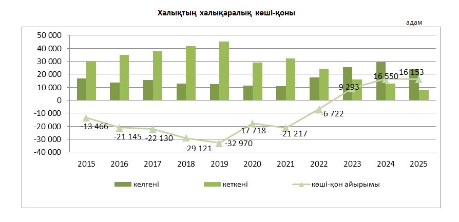 2025 жылы Қазақстанға тұрақты тұруға 23 761 адам келіп, 7 608 адам елден кеткен. Нәтижесінде сыртқы көші-қонның оң сальдосы 16 153 адамды құрады, деп хабарлайды ресми деректер. Бұл қатарынан үшінші жыл оң көрсеткіш тіркеліп отырғанын білдіреді.
