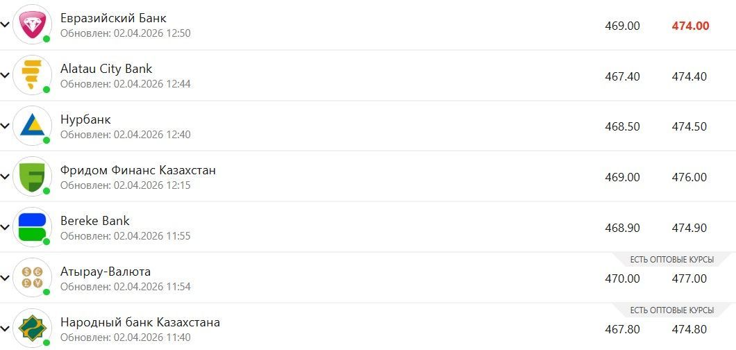 2 сәуірдегі жағдай бойынша Атыраудағы айырбастау пункттерінде АҚШ валютасы орта есеппен 475 теңгеден сатылып, 468 теңгеден сатып алынуда. Ұлттық банктің ресми бағамы осы күні — 475,09 теңге.