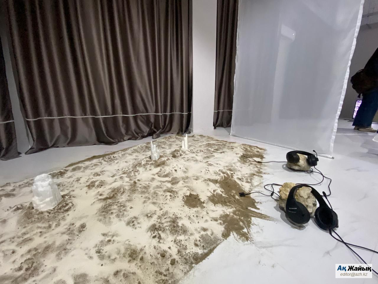 Атыраудағы мұнай өндіру аймақтарында жүргізілген далалық зерттеулерге негізделген мультимедиялық инсталляция ұсынылды. Бір бұрышында топырақ үлгілері мен құлаққаптар қойылған.