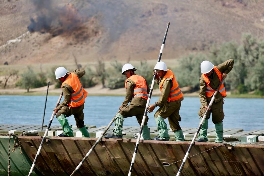 На платформу погружены автомобили с элементами понтонно-мостового парка, Урал-4320, плавающий транспортер, средства связи и вспомогательное имущество. Для наведения паромной переправы направлено 15 военнослужащих. Силами и средствами войсковой части 58012 Конаевского гарнизона будет наведена 60-тонная паромная переправа для перевозки гражданского населения, техники, материальных средств и животных в период паводка.