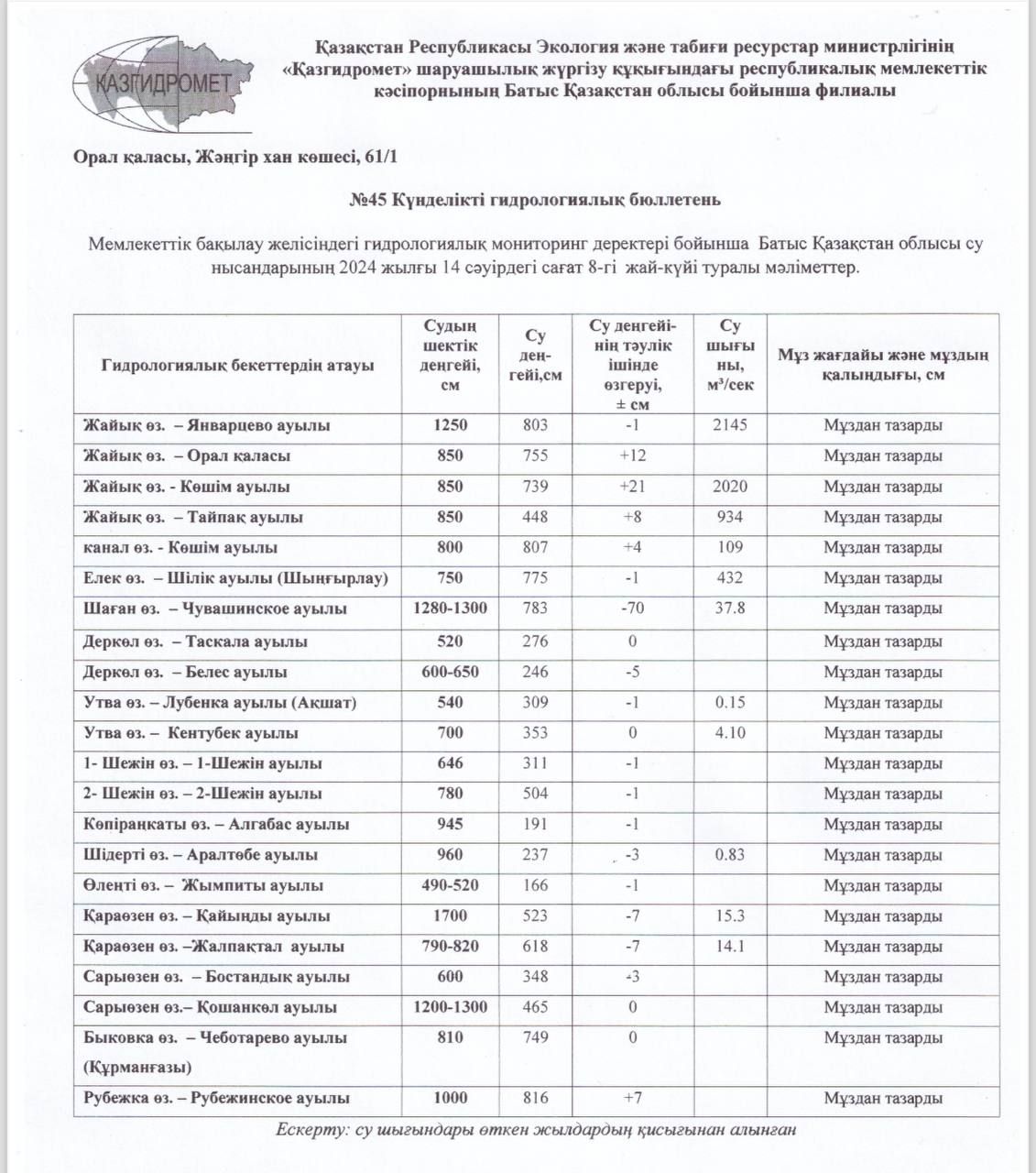 Уровень реки Урал на 08:00 часов составил 755 см над нулем поста, за 18 часов +8 см при опасном 850 см. Общий подъем с начала паводка составил более 6 метров. На сегодняшний день уровень воды в реке Урал поднялся за счет местных стоков и рек, расположенных в среднем течении. Во второй половине апреля ожидается подъем воды за счет паводка на реке Сакмара и сбросов воды из Ириклинского водохранилища.