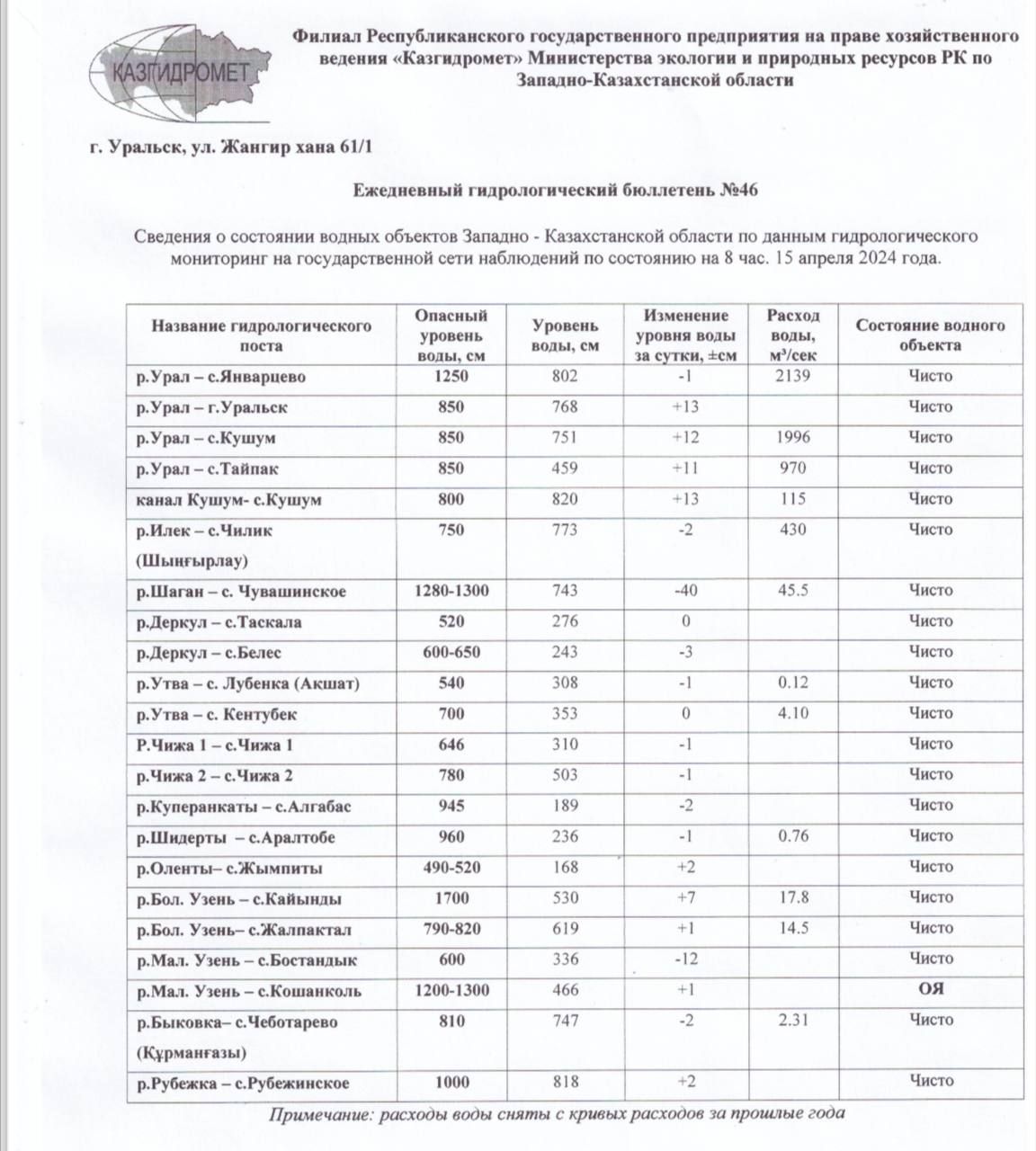 Данные по уровням на реках в ЗКО по состоянию на 8:00 утра 15 апреля