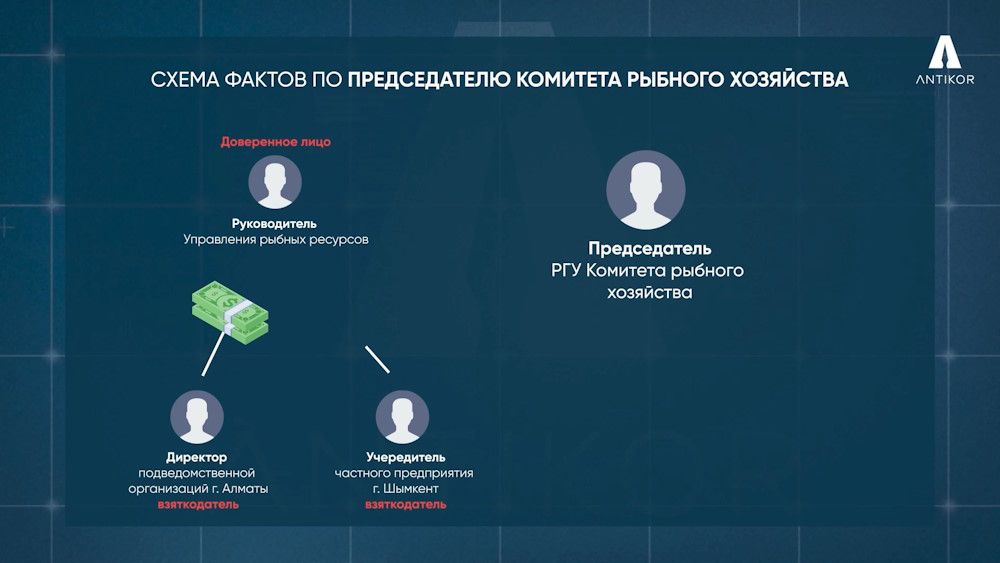 Антикоррупционной службой завершено расследование в отношении председателя Комитета рыбного хозяйства МСХ РК и руководителя управления охраны рыбных ресурсов и регулирования рыболовства Комитета по подозрению в получении взяток на системной основе от представителей малого и среднего бизнеса в период с 2021 года по февраль 2024 года за общее покровительство.