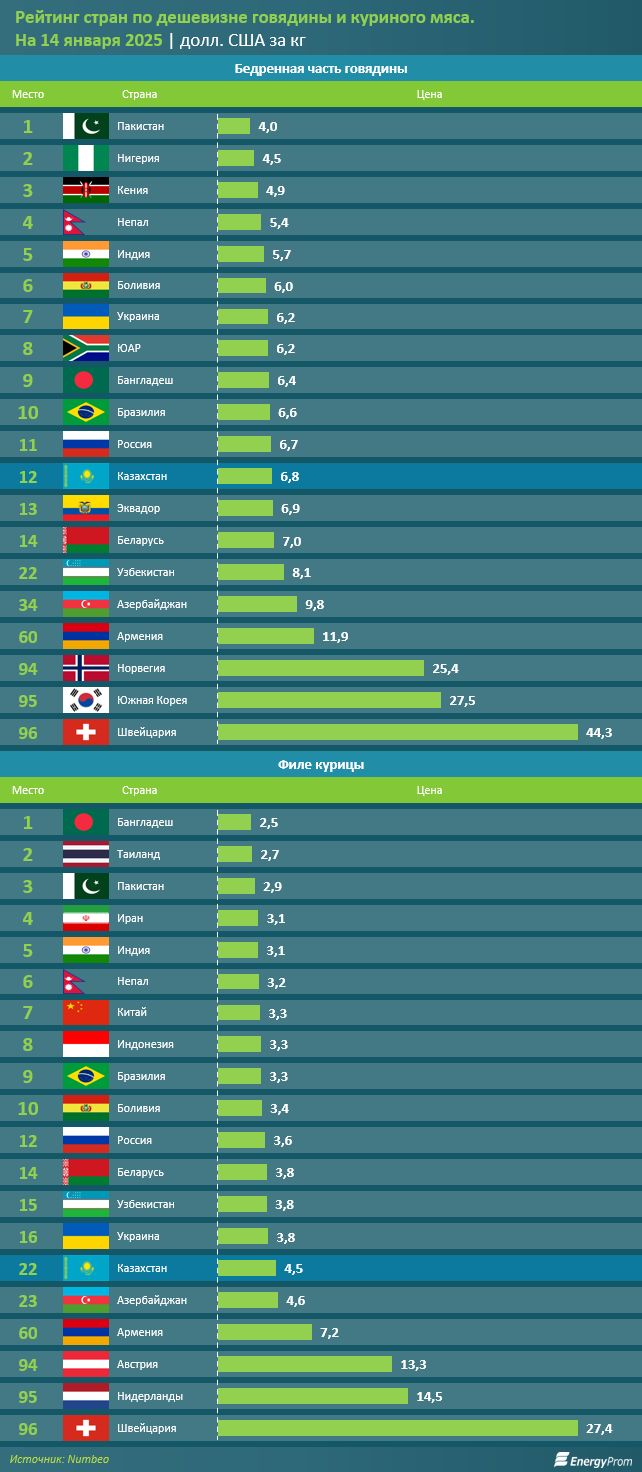 Если же рассматривать РК в сравнении с другими странами, ситуация будет следующей. На 14 января 2025 года Казахстан расположился на 12-м месте в мире по дешевизне говядины (бедренной части) и на 22-м месте по дешевизне курицы (филейной части). Цена говядины в стране составляла 6,8 долл. США за кг, курицы — 4,5 долл. США за кг.