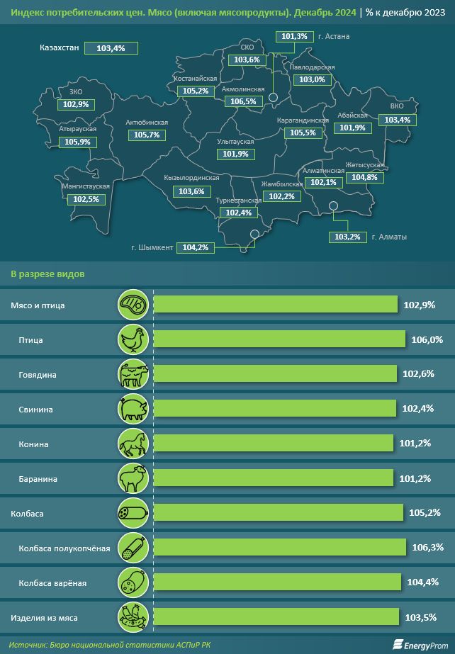 По итогам декабря прошлого года цены на мясо и мясопродукты в РК выросли на 3,4% по сравнению с декабрём 2023-го. В том числе мясо и птица подорожали на 2,9%, колбасы — на 5,2%, изделия из мяса — на 3,5%. Непосредственно птица выросла в цене на 6%, говядина — на 2,6%, свинина — на 2,4%, конина и баранина — на 1,2%. Среди колбас полукопчёная стала дороже на 6,3%, варёная — на 4,4%, сообщает energyprom.kz.