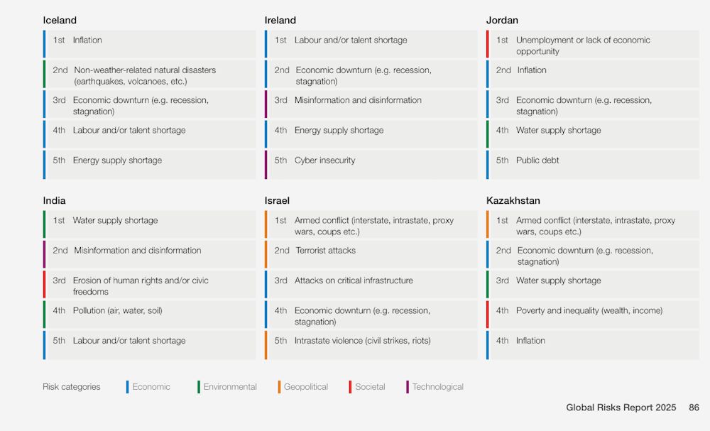 В ежегодном докладе Global Risk Report, опубликованном Всемирным экономическим форумом (WEF), Казахстан оказался в числе 12 стран (Армению, Колумбия, Кот-Д Ивуар, Ирак, Израиль, Латвия, Румыния, Польша) с высоким риском вооруженных конфликтов в ближайшие два года. Однако данный прогноз вызывает вопросы и требует уточнения. Вооруженные конфликты не являются первостепенной угрозой для нашей страны, учитывая текущую военно-политическую ситуацию, дипломатию Казахстана и его ключевые инвестиционные проекты. Ведущий эксперт АО "Центр военно-стратегических исследований" полковник запаса Данияр ДАРХАНОВ в данной статье разбирает, почему этот риск нельзя считать главным.