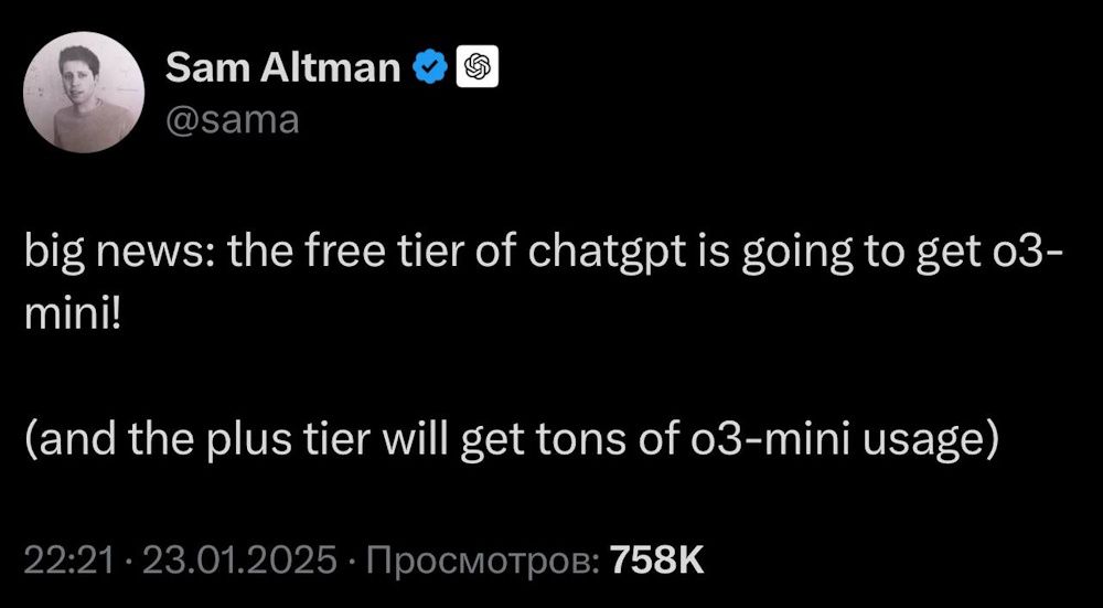 Младшая версия самой продвинутой модели ChatGPT o3-mini будет бесплатной, заявил глава компании OpenAI Сэм Альтман.