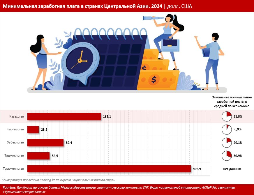 Минимальная зарплата выше тоже в Казахстане. В прошлом году она составляла 85 тыс. тг, или 181,1 долл. США. В других странах Центральноазиатского региона показатели были значительно ниже: в Узбекистане — 89,4 долл. США, в Таджикистане — 54,9 долл. США, в Кыргызстане — 28,3 долл. США. Высокой в пересчёте на доллары может показаться минимальная зарплата и в Туркменистане (402,9 долл. США). Однако эта информация неоднозначна. Конвертация минимальной зарплаты в 1410 манатов проведена по официальному курсу доллара, представленному Национальным банком Туркменистана. Согласно информации этого источника, 1 доллар США в стране уже более пяти лет равен 3,5 туркменского маната. Однако, судя по многочисленным экспертным интервью, поменять манаты по такому курсу внутри Туркменистана фактически невозможно, а все сделки купли-продажи валюты в стране проводятся по «чёрному» курсу (1 к 19). При таком раскладе минимальная зарплата в этой стране в 2024 году составляла 74,2 долл. США.