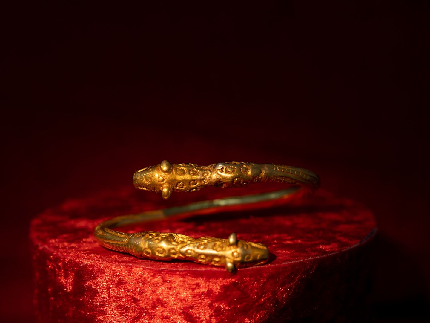 – Два пробных камня с золотой ручкой, никогда ранее не встречавшиеся в стране, были обнаружены в кургане Карабау-2. Ранее сарматы определяли подлинность и качество золота с помощью этого камня. В настоящее время такие камни используют те, кто занимается покупкой золота. Также в местах захоронения были обнаружены золотые наклейки на одежде человека. Их вес начинается с двух граммов. Самым тяжелым золотым украшением является браслет, изображающий горного леопарда с обеих сторон. Его вес около 370 граммов, – рассказал заведующий отделом археологического научно-исследовательского обеспечения Атырауского областного историко-краеведческого музея Галамат Базарбаев.