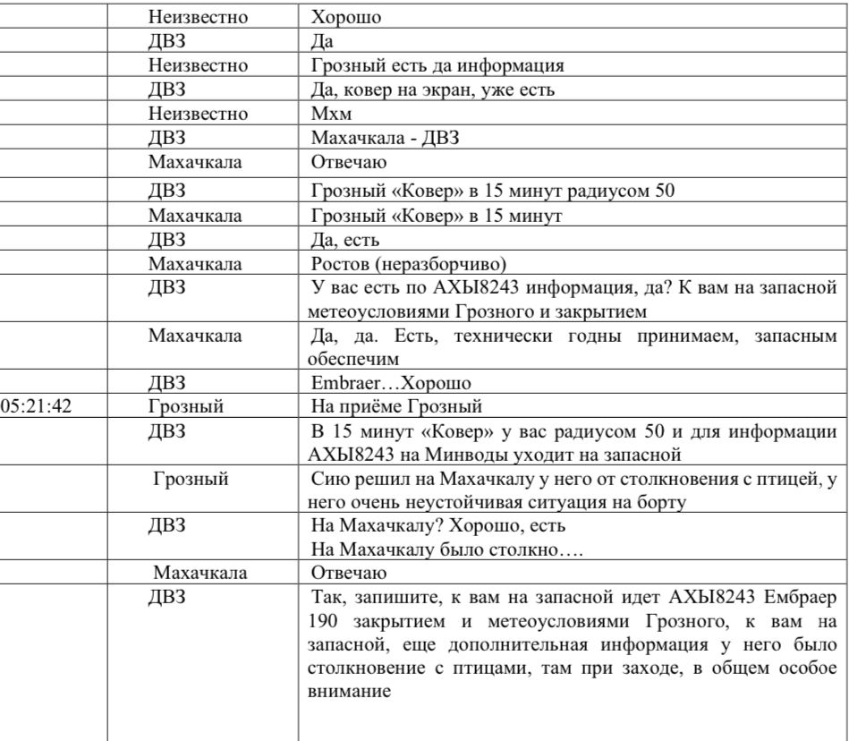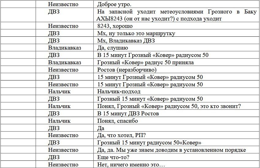 «Согласно информации из средств объективного контроля, ДВЗ Регионального центра Единой системы организации воздушного движения (Ростов-на-Дону) информирует о введении плана «Ковёр». Ниже приводится фрагмент переговоров:
