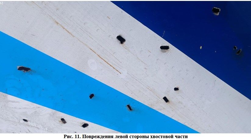 - Большинство сквозных повреждений находятся в киле и стабилизаторе. Визуальный осмотр сквозных повреждений показывает, что некоторые из них сквозные, в то время как другие являются глухими/несквозными повреждениями.