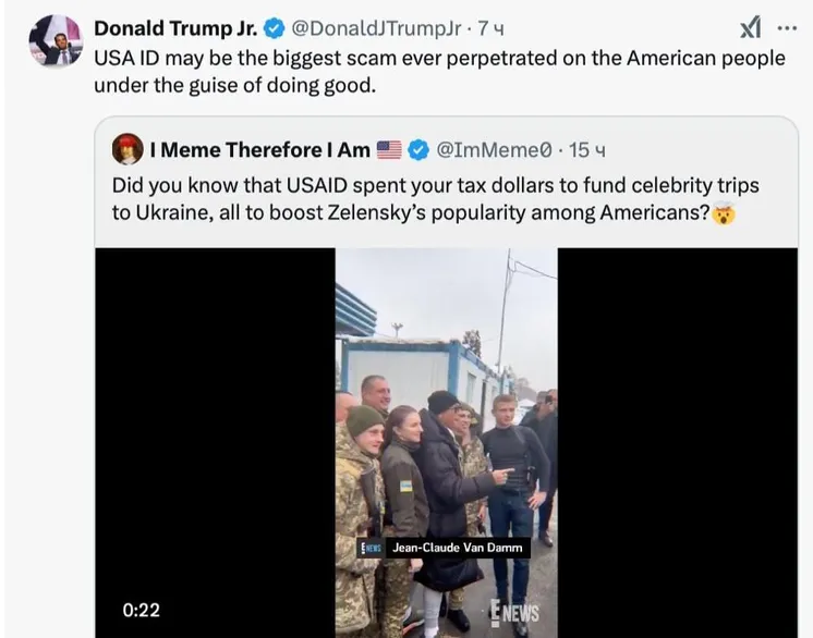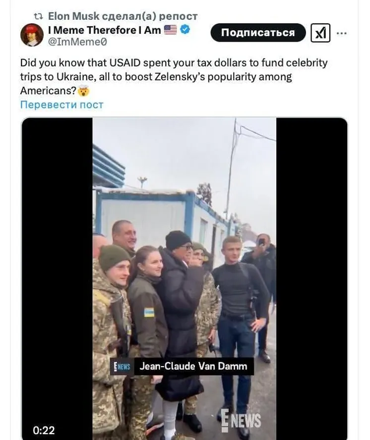 Видео, которое репостнули Маск и Трамп, - подделка под ролик американского издания E! News. В ролике говорится, что USAID оплачивала поездки американских звезд в Украину после начала войны. Среди перечисленных звезд, которым якобы платило агентство, Анджелина Джоли, Шон Пенн, Жан-Клод Ван Дамм, Орландо Блум и Бен Стиллер.