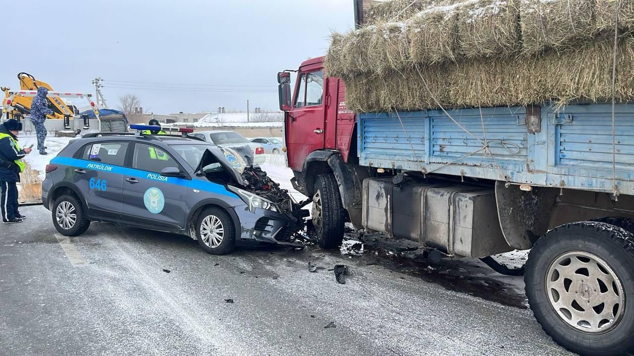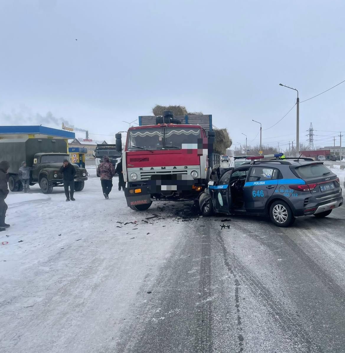 Экипаж батальона патрульной полиции, патрулируя улицу Би-Боранбая, направлялся на вызов о семейном скандале, когда их служебная машина столкнулась с грузовиком.
