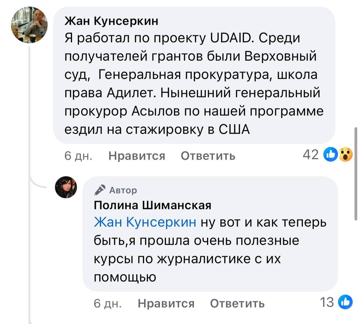 Ранее по соцсетям разлетелся вот этот скрин, на котором известный казахстанский адвокат Жан Кунсеркин пишет, что среди получателей грантов USAID были Верховный суд, Генеральная прокуратура, школа права «Адилет».
