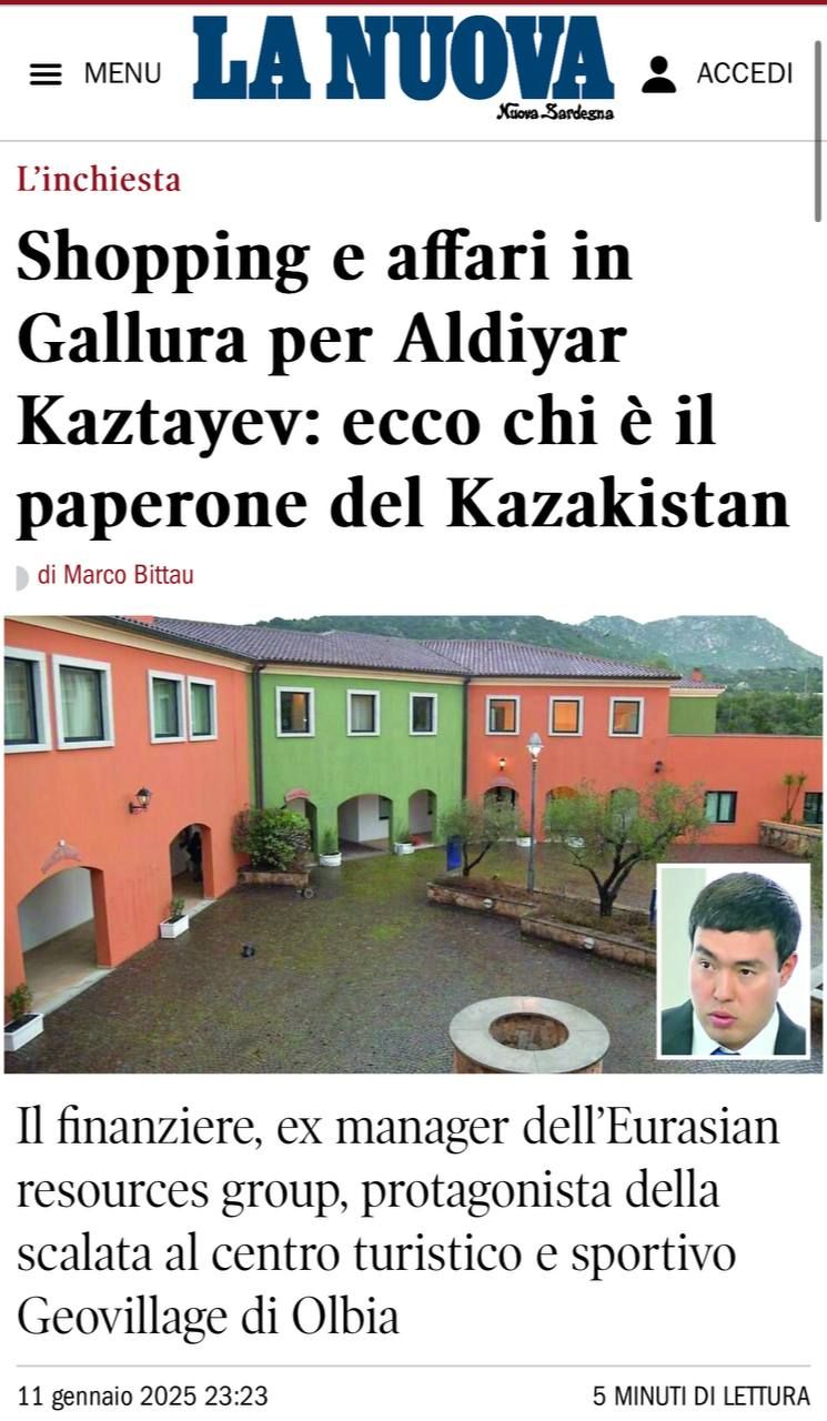 Итальянская пресса пишет, что Казтаев приобрел туристический и спортивный комплекс Geovillage в Ольбии за 14 млн евро. Объект, переживший череду банкротств и судебных разбирательств, теперь станет частью нового проекта международной частной школы премиального уровня, годовое обучение в которой обойдется в 18 тысяч евро, передает Nege.Aqsha.