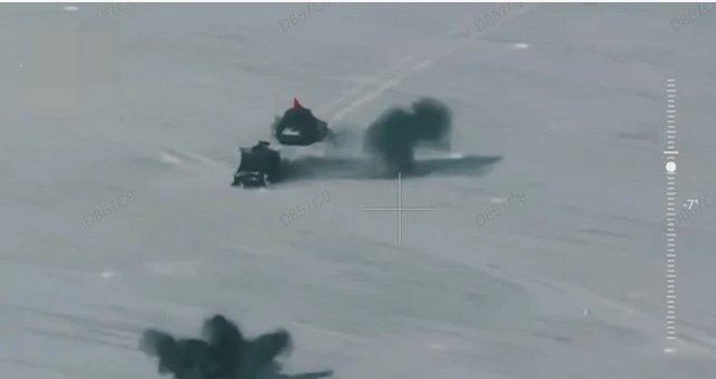 На записи видно, как российские танки и бронетранспортёры с противодронными сетками движутся по заснеженному полю, подрываясь один за другим. Фото: Social Media