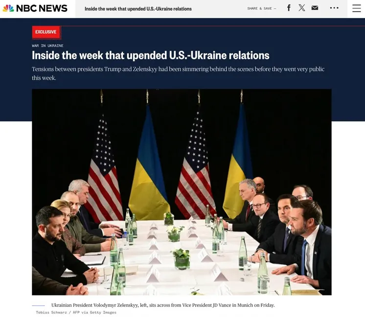 Зеленский, как пишет NBC, был «ошеломлен» подходом американского министра. Он сказал, что ему нужно время на изучение предложения. Бессент ответил, что на подписание договора у Зеленского есть час, иначе могут быть отменены его встречи с вице-президентом США Джей Ди Вэнсом и госсекретарем Марко Рубио. В Киеве считали, что эти встречи были ключевыми для понимания стратегии Трампа в отношении переговоров.