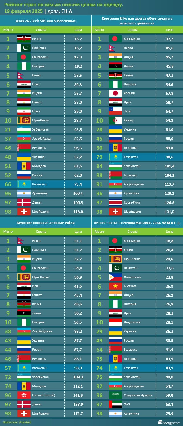 По дешевизне джинсов Казахстан занял 66-е место из 98 в мире, мужских кожаных деловых туфель — 57-е, кроссовок — 79-е, летних платьев — 74-е.