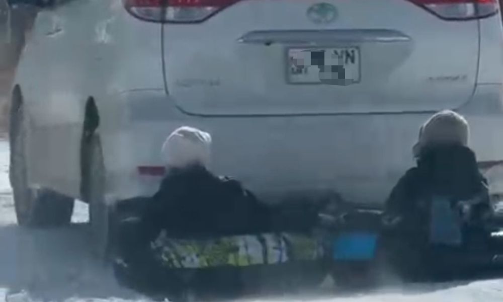 В социальных сетях стало популярным видео, на котором запечатлен момент катания двоих детей на тюбингах, привязанных к автомобилю.