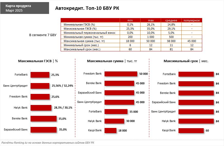 У Halyk Bank максимальная ГЭСВ по займам для новых авто составляет 28,3%, для авто с пробегом — уже 30,1%. Bereke Bank и Евразийский Банк и вовсе просто сразу указывают в качестве максимальной ГЭСВ предельно допустимую регулятором величину — 35%. Кстати, оба эти банка также предлагают кредиты как на новые, так и на имеющие пробег автомобили.
