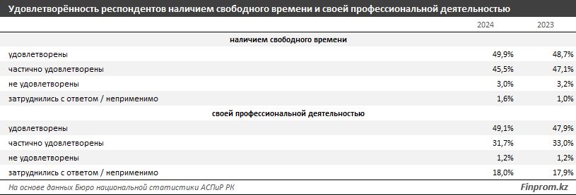 В 2024 году в опросе о качестве жизни, проведённом среди более чем 11,9 тыс. казахстанских домохозяйств Бюро национальной статистики (БНС) АСПиР РК, респонденты оценивали свою удовлетворённость наличием свободного времени и профессиональной деятельностью, сообщает Finprom.kz