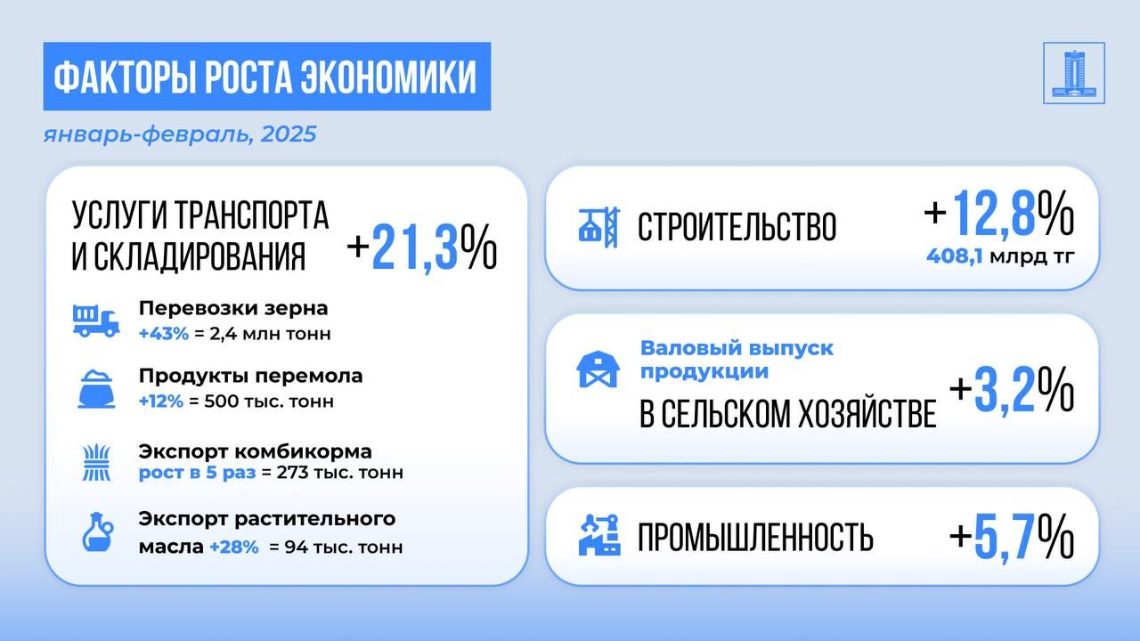 По информации, высокие темпы сохраняются в строительстве, где объем работ составил Т408,1 млрд, ИФО – 112,8%. Сообщается, что в сфере торговли динамика роста составила 6%, услуги транспорта и складирования выросли на 21,3%.