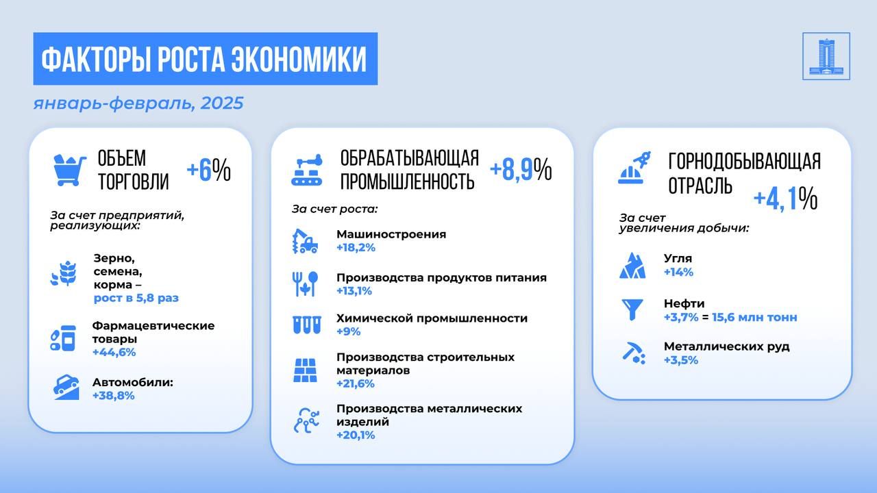 По данным, в обрабатывающей промышленности показатель составил 8,9%. Среди ключевых отраслей отмечены машиностроение (18,2%), производство продуктов питания (13,1%), строительных материалов (21,6%) и металлических изделий (20,1%), химическая промышленность (9%). Отмечается, что в горнодобывающей промышленности показатели роста на уровне 4,1%.