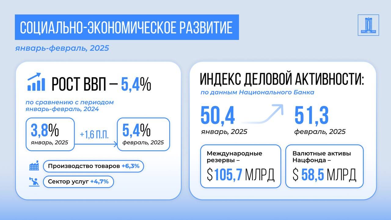 «Рост ВВП за отчетный период составил 5,4%. Улучшение динамики наблюдается в производстве товаров и в секторе услуг. Проводимая работа по раскрытию промышленного потенциала позволила нарастить объем промпроизводства на 5,7%», - говорится в сообщении.